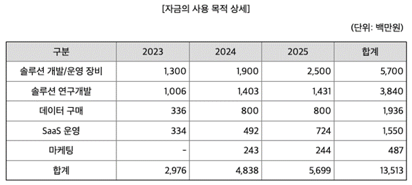 시설자금으로는 인공지능 기술과 빅데이터 기술의 고도화를 위한 IT 장비에 약 57억 원의 투자를 계획하고 있으며 그외 운영자금으로 솔루션 연구개발비, 데이터 구매 비용, SaaS 운영비용 등에 사용할 예정이라고 해요.