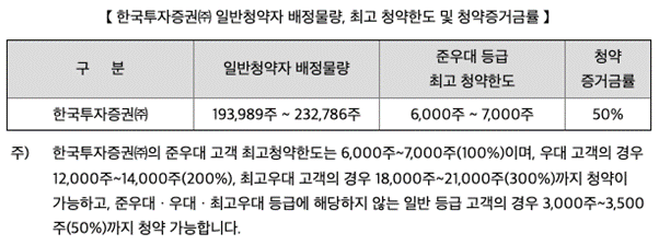 한국투자증권은 일반 청약자에게 3,000~3,500주를, 우대 청약자에게는 6,000~21,000주를 배정했습니다.