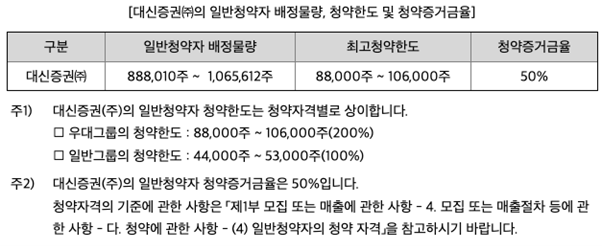 대신증권은 일반 청약자에게 44,000~53,000주를, 우대 청약자에게는 88,000~105,000주를 배정했으며 청약 증거금률은 50%입니다.